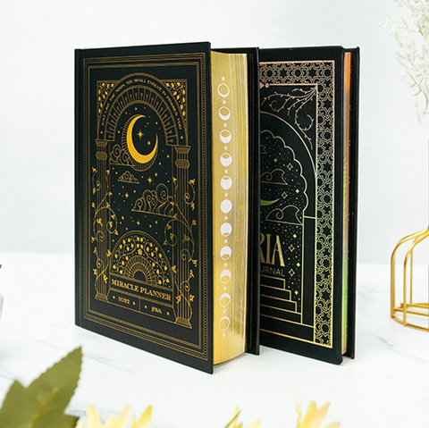 Diario de tapa dura de cuero PU con logotipo personalizado, nuevo diseño, papel de aluminio dorado, cuaderno de tamaño A5 a la moda